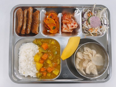 메뉴: 카레라이스/ 유부장국/ 수제돈까스/ 야채샐러드/ 단무지무침/ 김치/ 후식
