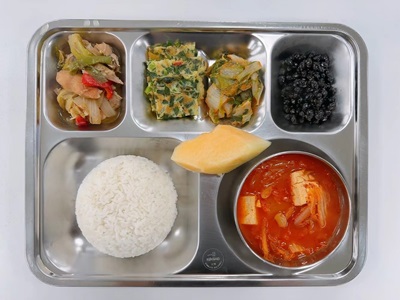 메뉴: 찹쌀밥/ 참치김치찌개/ 닭고기볶음/ 부추전/ 얼갈이무침/ 콩자반/ 후식