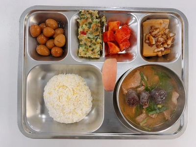 메뉴: 차조밥/ 얼큰순대국/ 해물파전/ 간장두부구이/ 메추리알장조림/ 깍두기/ 후식