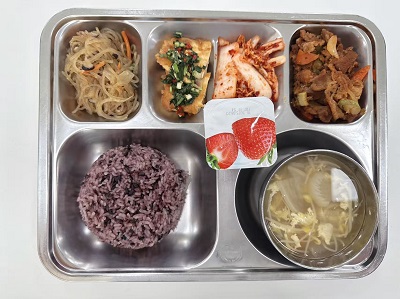 메뉴: 흑미밥/콩나물무국/고추장불고기/한식잡채/두부구이/배추김치/과일요거트