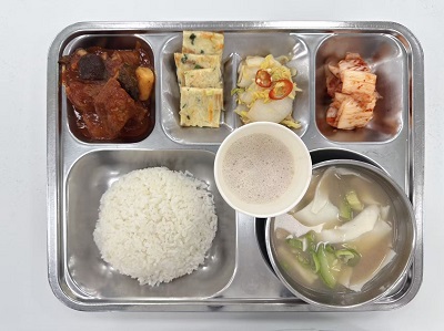 메뉴:찹쌀밥/들깨수제비/매운돈육찜/팽이버섯전/배추된장무침/배추김치/바나나쉐이크