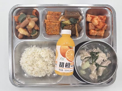 메뉴:현미밥/닭곰탕/소시지볶음/해물김치전/도토리묵무침/깍두기/과일쥬스