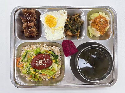 메뉴:보리비빔밥/홍합미역국/수제떡갈비/계란후라이/양배추쌈/열무김치/계절과일