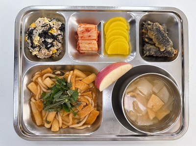 메뉴: 참치마요비빔밥/어묵탕/국물떡볶이/김말이튀김/단무지/배추김치/계절과일