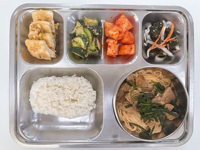 메뉴:찹쌀밥/얼큰돼지국밥/두부구이/미역초무침/오이고추무침/깍두기/계절과일