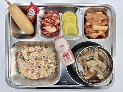 메뉴:소세지볶음밥/가쓰오장국/떡볶이/한식핫도그/댠무지/배추김치/요구르트