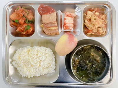 차조밥/소고기미역국/햄계란구이/참치감자조림/토마토계란볶음/배추김치/계절과일