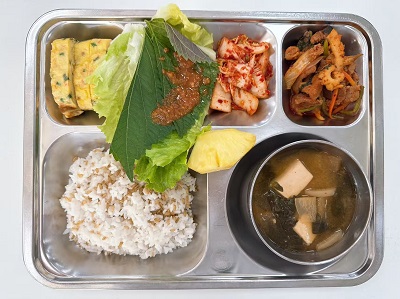 귀리밥/시금치된장국/오삼불고기/계란말이/모듬쌈채소/배추겉절이/계절과일
