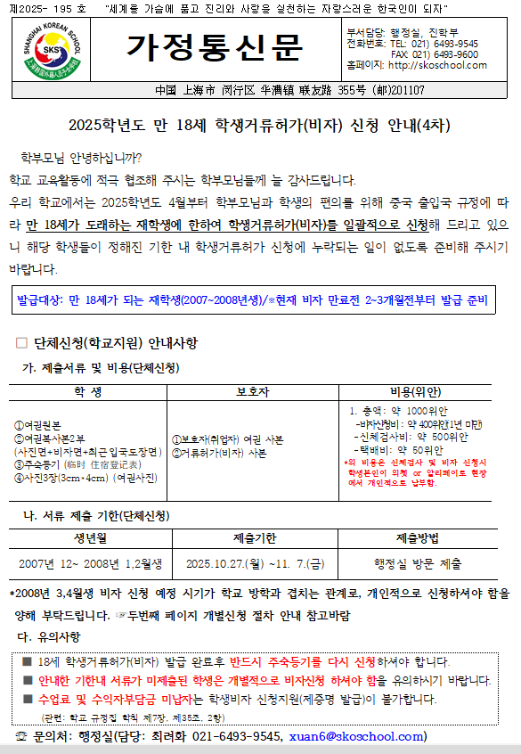 [행정]2025학년도 18세 학생비자 신청 안내 가정통신문 4차