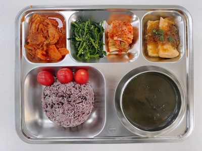 메뉴: 흑미밥/ 미역국/ 김치제육볶음/ 두부조림/ 시금치무침/김치/ 후식