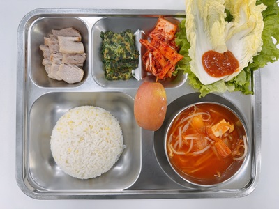 메뉴: 차조밥/ 콩나물김치국/ 영양보쌈/ 부추전/ 모듬쌈채소/보쌈무김치/ 후식