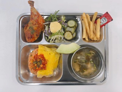메뉴: 오므라이스/ 유부장국/ 닭다리구이/ 감자튀김/ 양상추샐러드/ 피클/ 후식