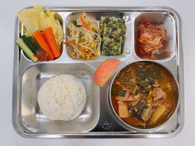 메뉴: 차조밥/ 순살감자탕/ 부추전/ 콩나물무침/ 야채스틱/ 김치/ 후식