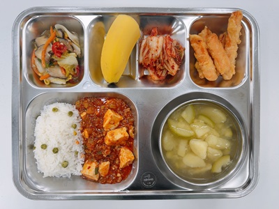 메뉴: 완두콩밥/ 감자애호박국/ 마파두부/ 고구마튀김/ 배추볶음/ 김치/ 후식