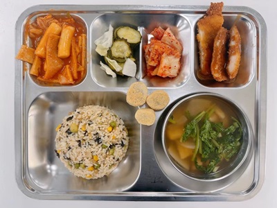 메뉴: 데리야끼볶음밥/ 유부장국/ 치킨까스/ 떡볶이/ 모듬피클/ 김치/ 후식