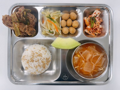 메뉴: 귀리밥/ 얼큰콩나물국/ 돼지등뼈찜/ 메추리알조림/ 감자채볶음/ 배추겉절이/ 후식