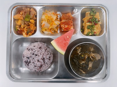 메뉴: 흑미밥/ 소고기미역국/ 오징어볶음/ 두부구이/ 배추된장무침/ 김치/ 후식