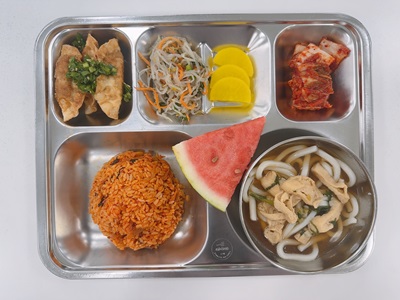 메뉴: 김치볶음밥/ 어묵우동/ 만두튀김/ 숙주무침/ 단무지/ 김치/ 후식