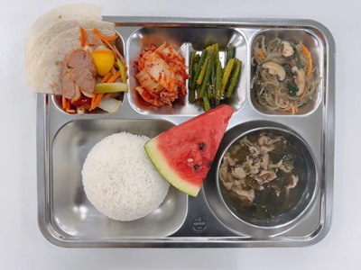 메뉴: 찹쌀밥/ 소고기미역국/ 훈제오리볶음&전병/ 버섯잡채/ 마늘쫑무침/ 김치/ 후식