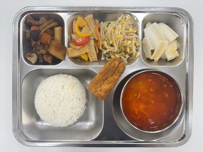 메뉴: 찹쌀밥/ 해물순두부찌개/ 순살돈육찜/ 어묵채볶음/ 콩나물무침/ 배추김치/ 콩가루요티아오