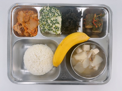 메뉴: 기장밥/ 황탵무국/ 돈육김치찜/ 영양계란찜/ 수제김자반/ 오이김치/ 계절과일
