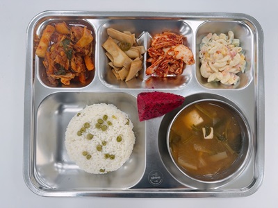 메뉴: 완두콩밥/ 시금치된장국/ 춘천닭갈비/ 마카로니샐러드/ 새송이버섯볶음/ 양배추겉절이/ 계절과일