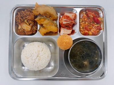 메뉴: 찰현미밥/ 소고기미역국/ 고추장불고기/ 토마토계란볶음/ 단호박튀김/ 배추김치/ 베이비슈