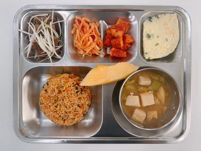 메뉴: 소보로비빔밥/ 청국된장찌개/ 너비아니&파채소스/ 날치알계란찜/ 야채배추채무침/ 깍두기/ 계절과일