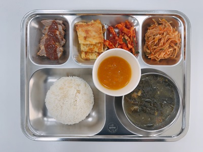 메뉴: 현미밥/ 황태미역국/ 한방목살보쌈/ 물쫄면/ 감자채전/ 보쌈무김치/ 호박죽