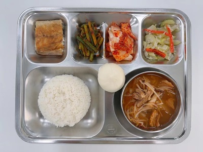 메뉴: 차조밥/ 소고기육개장/ 고등어구이/ 새우젓애호박볶음/ 마늘쫑무침/ 배추김치/ 단팥빵