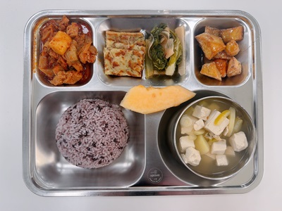메뉴: 흑미밥/ 애호박감자국/ 돈육김치찜/ 광장빈대떡/ 고구마맛탕/ 얼갈이무김치/ 계절과일