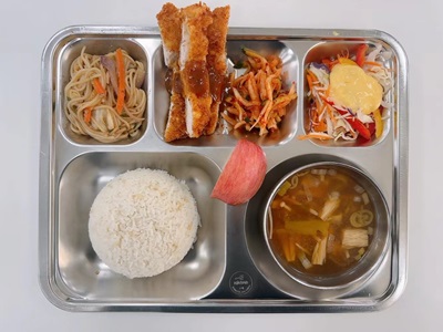 메뉴: 현미밥/ 미소된장국/ 볶음쌀국수/ 수제치킨까스/ 양배추샐러드/ 오이무생채/ 과일
