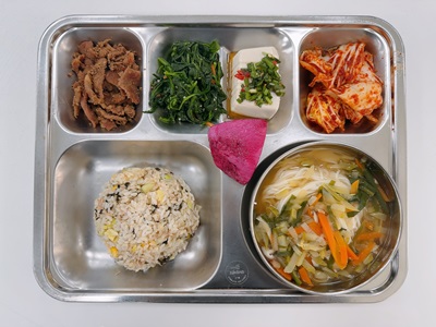 메뉴: 참치마요비빔밥/ 잔치국수/ 양념돈육구이/ 연두부&양념장/ 시금치무침/ 배추겉절이/ 과일