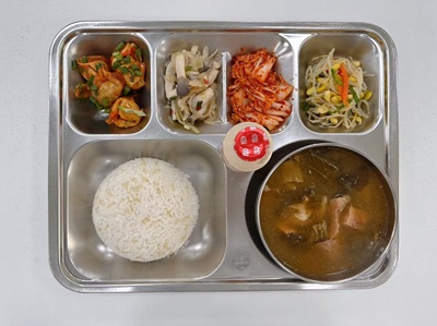메뉴:현미밥/순살감자탕/만두튀김/콩나물무침/느타리버섯볶음/배추겉절이/요구르트