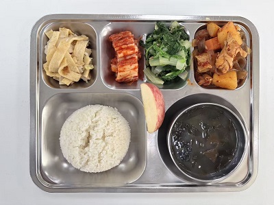 메뉴:찹쌀밥/황태미역국/닭도리탕/어묵조림/얼갈이볶음/배추김치/계절과일