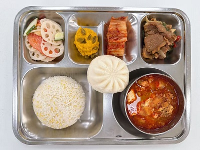 메뉴:차조밥/순두부찌개/오리훈제볶음/단호박샐러드/연근무침/배추김치/단팥찐빵