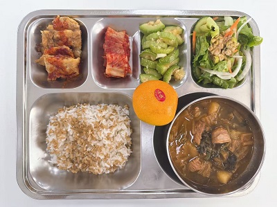 메뉴: 귀리밥/순살감자탕/고기육전/애호박볶음/상추겉절이/배추김치/계절과일