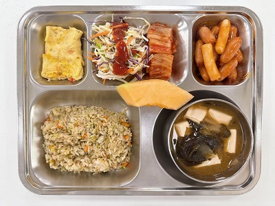 메뉴:야채볶음밥/미소된장국/소떡소떡/치즈오믈렛/야채샐러드/배추김치/계절과일