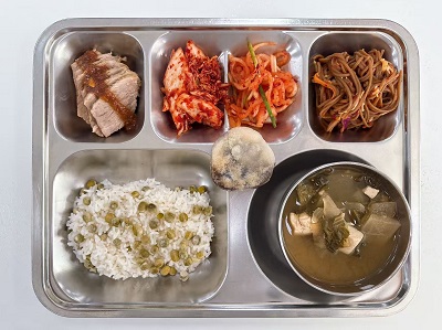 메뉴:완두콩밥/우거지된장국/한방보쌈/비빔막국수/무생채/배추겉절이/찰떡구이