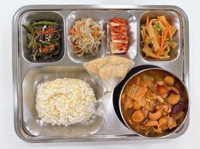 메뉴:차조밥/부대찌개/어묵볶음/멸치고추볶음/숙주무침/배추김치/인절미