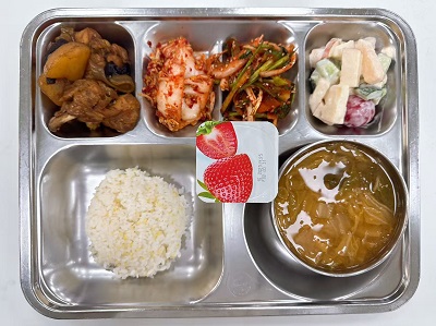 메뉴:차조밥/배추된장국/안동식찜닭/과일사라다/미나리오이무침/배추겉절이/과일요거트