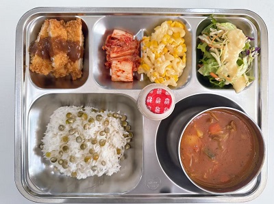 메뉴:완두콩밥/토마토카레스튜/수제치킨까스/치즈마카로니/양배추샐러드/배추김치/요구르트