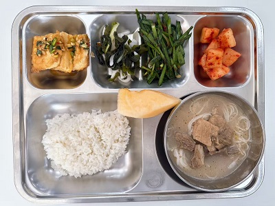 메뉴:찹쌀밥/돼지국밥&소면/양념두부구이/미역초무침/부추무침/깍두기/계절과일